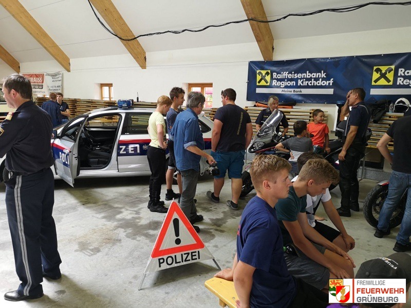 Danke an Rotes Kreuz Bezirk Kirchdorf/Krems für die Bereitstellung eines Rettungswagens und das teils sehr realistische Schminken von wunden an den Kindern. Die Bergrettung Oberösterreich stellte ihr know how beim Kistenklettern zur Schau.Danke an die Kameraden der verschiedenen Stützpunkte die mit den Stützpunktfahrzeugen vor Ort waren ,den Mitarbeitern ARBÖ 1-2-3 die mit dem Aufprallsimulator für Staunen sorgten und ein besonderer Dank an die Polizei Oberösterreich die mit Motorrädern , einem Streifenwagen, einem Hubschrauber und mit den Polizeihunden für große Augen bei den Kindern und auch bei den Betreuern sorgten.